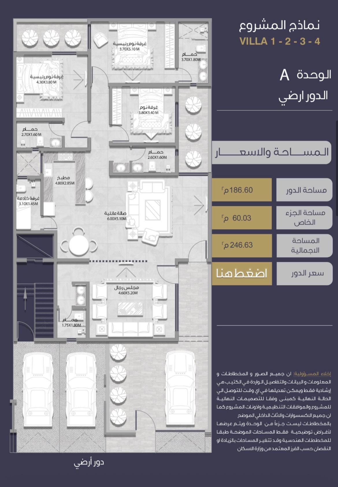 | فيلا رقم 3 - الدور الأول | 3 | 5 | 1 | 2 | - | حصري ومودرن | 187 م² | 1,700,000 |