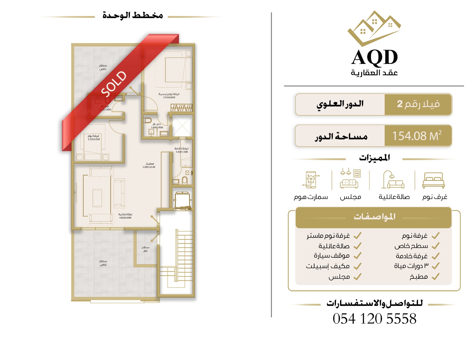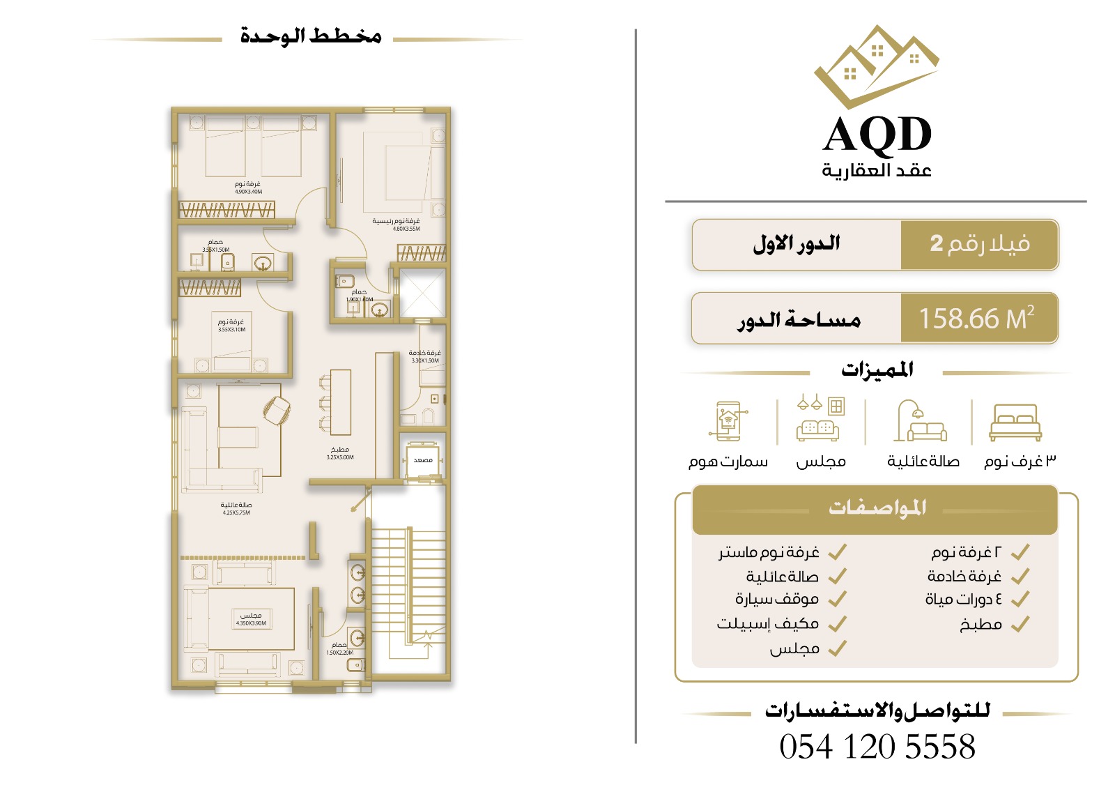 | فيلا رقم 2 - الدور الأول | 3 | 5 | 1 | 2 | - | حصري ومودرن | 159 م² | 1,650,000 |