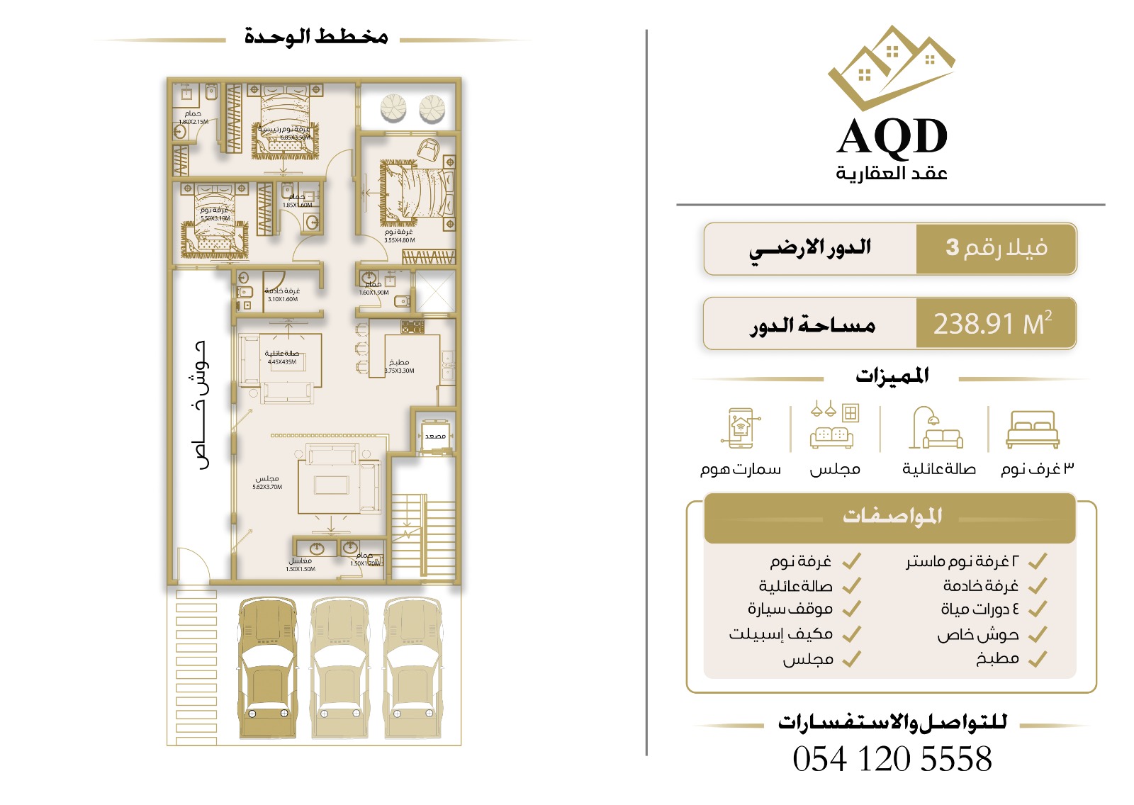 | فيلا رقم 3 - الدور الارضي | 3 | 5 | 1 | 2 | - | حصري ومودرن | 239 م² | 2,200,000 |