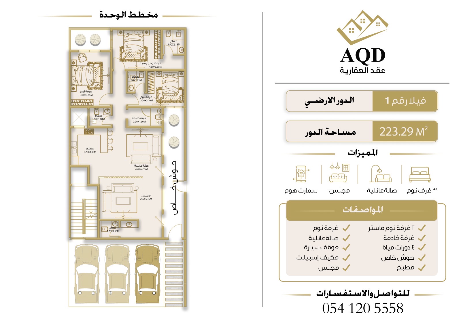 | فيلا رقم 1 - الدور الارضي | 3 | 5 | 1 | 2 | - | حصري ومودرن | 223 م² | 2,100,000 |