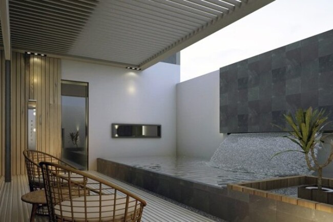 الدور الأرضي : زجاج استركشر أضاءه طبيعية / مدخل يتسع لسيارتين / مجلس / مقلط / صالة دبل هايت / مصعد جيرليس / مسبح overflow مع جلسة خارجية / مطبخ / مدخل خدمات للمطبخ / غرفة سائق / غرفة خادمة / غرفة غسيل / مخزن
