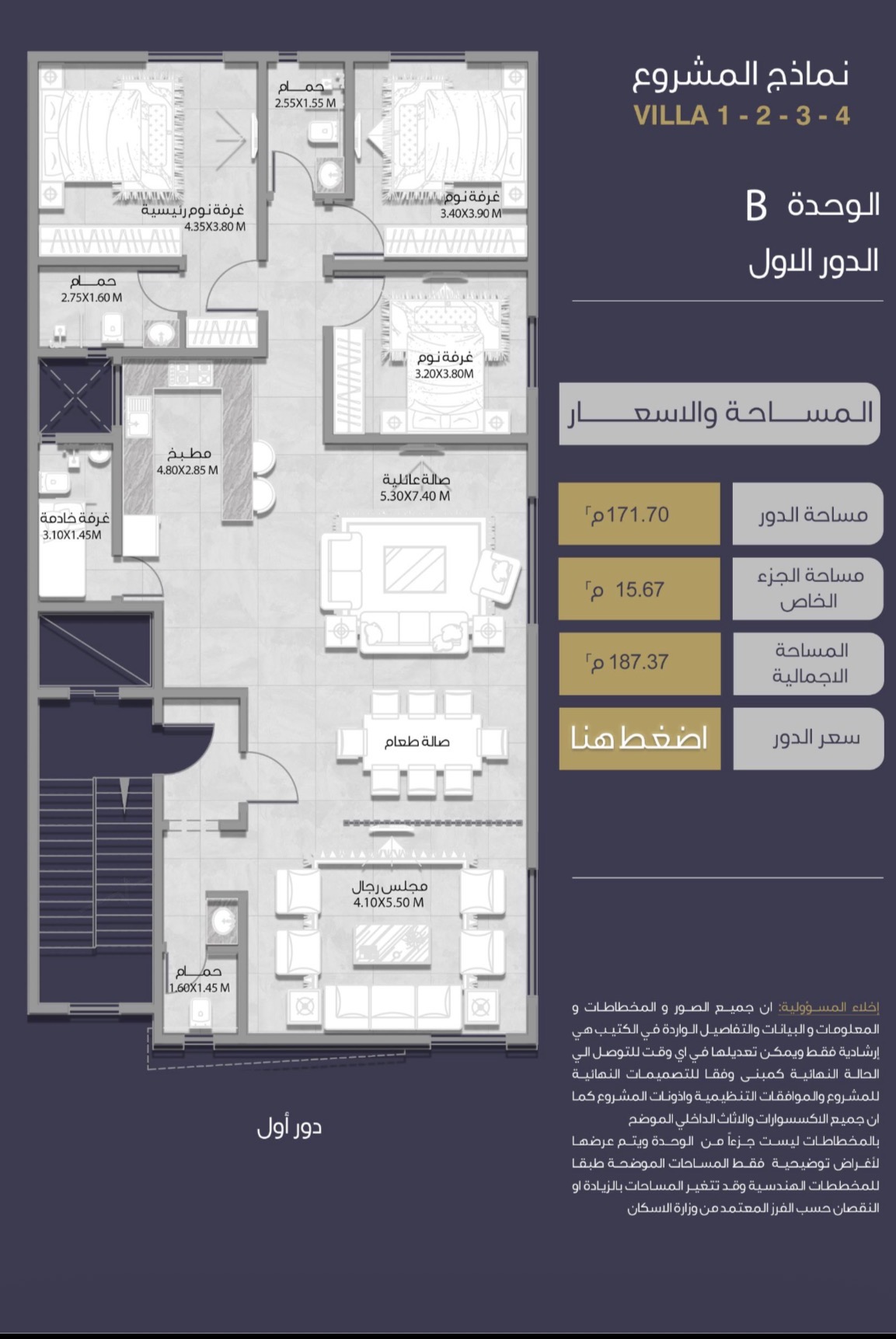 | فيلا رقم 3 - الدور الأول | 3 | 5 | 1 | 2 | - | حصري ومودرن | 187 م² | 1,700,000 |